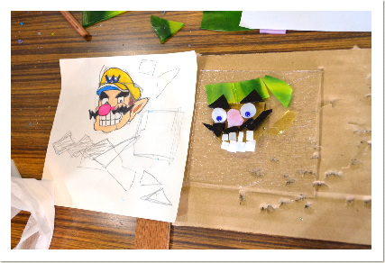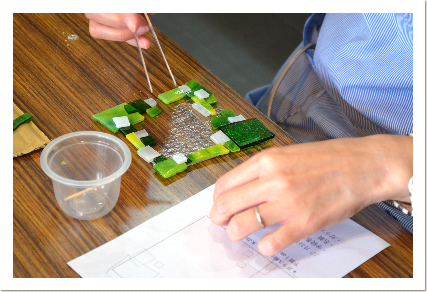 自分のデザイン画どおりにガラスカッターでガラスを切ったり。色や配置を変えてみたり。